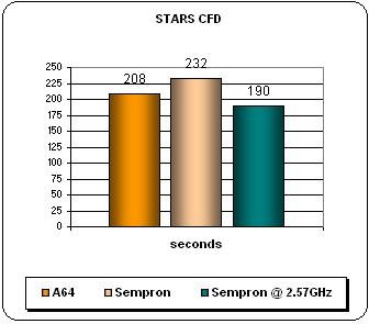 Этот тест, предусмотренный лабораторией Oklahoma State University, является отличным инструментом представляющим общий вычислительный гидродинамический симулятор. Этот тест, также является примером чистой плавающей точкой математической способности. После всего, что дополнительные частоты добавили сверху, Sempron, наконец,смог конкурировать с A64 3200 + , на его нормальной 2 ГГц способности (~ 195s). Это занимает довольно  много дополнительных усилий в этом приложении, чтобы компенсировать кэш дифференциала. FX-55 будет наводить порядок , учитывая его 1 Мб кэш-памяти, а также скорость 2,6 часа.
