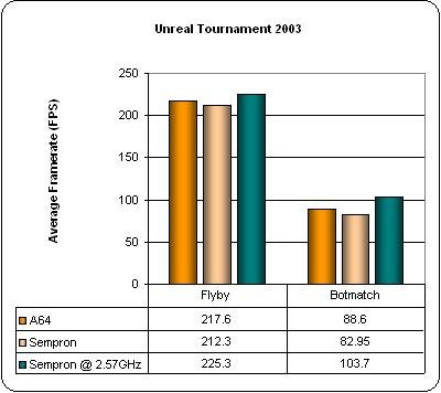 В играх, A64 имеет небольшее преимущество над своими меньшими братьями. Но если разогнать Sempron 3100 +, это преимущество исчезает . Тест Botmatch, очевидно, показывает  большую зависимость от мощности процессора, имея для расчета AI и физику ботов. Прирост  в тесте меньше по изменению  возможностей процессора.
