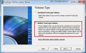 Далее вам будет предложено выбрать тип тома. Так как вы создаёте скрытый раздел, выберите «Скрытый том TrueCrypt», затем нажмите кнопку «Далее».