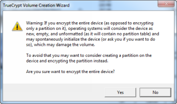 TrueCrypt предупредит вас об опасности шифрования всего жесткого диска. Так как весь жесткий диск будет зашифрован, Windows распознает его как пустой не форматированный жесткий диск. При определенных условиях, Windows может автоматически попытатся отформатировать жесткий диск без какого-либо взаимодействия с вами. Это может привести к катастрофической потере данных, которые могли бы оказаться тому бесполезными.Вместо этого ,TrueCrypt советует шифровать раздел . Я использую TrueCrypt в течение нескольких лет и никогда не было так ,что бы Windows, спонтанно отформатировала зашифрованный жесткий диск. Либо мне повезло, и я не встречал правильных условий, при которых Windows будет это делать. На мой профессиональный взгляд, шифрование всего жесткого диска совершенно безопасно. Нажмите кнопку «Да», чтобы закрыть окно, а затем нажмите кнопку «Далее».