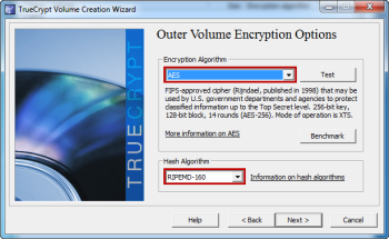 Теперь вам будет предложено выбрать метод шифрования,который вы хотите применить для внешнего тома. По умолчанию установлен алгоритм шифрования «AES» и хэш-алгоритм «RPIEMD-160″, и рекомендуется для их надежной защиты и производительности. После того как вы сделали свой выбор, нажмите кнопку «Далее».