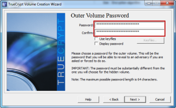 Теперь вам нужно будет ввести пароль для внешнего тома. Этот пароль, вы можете разглашать,если вдруг возникнет такая ситуация. Помните, что невозможно определить скрытый раздел, если вводится пароль на скрытый том . Даже если это пароль для внешнего тома, вы всегда должны использовать надежные пароли. Как только вы выбрали надежный пароль, нажмите кнопку «Далее».