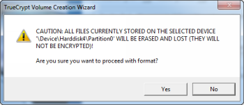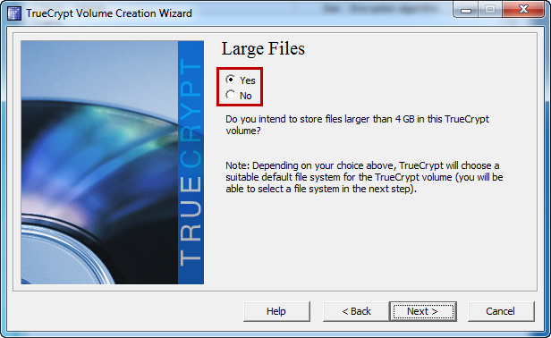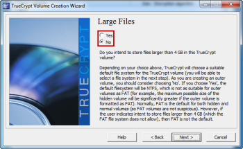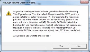 Вам будет предложено, как вы собираетесь хранить файлы размером более 4 ГБ на внешнем объеме. Вас спросили об этом, потому что системы FAT и NTFS файлов отличаются в отношении, как и где они хранят данные на жестком диске. Из-за ограничений, связанных с файловой системой NTFS, общий размер скрытого тома будет строго ограничен, если вы выбираете эту файловую систему. Поскольку это приманка для тома, вы не должны хранить слишком много информации, особенно файлы размером более 4 Гб.  Файловая система FAT ,даже рекомендуется разработчиками TrueCrypt. Но, если вы просто обязаны хранить файлы размером более 4 ГБ на внешнем томе, выберите «Yes» (вы увидите предупреждение), в противном случае, выберите «Нет» После того как вы сделали свой выбор, нажмите кнопку «Далее».