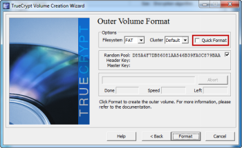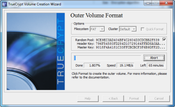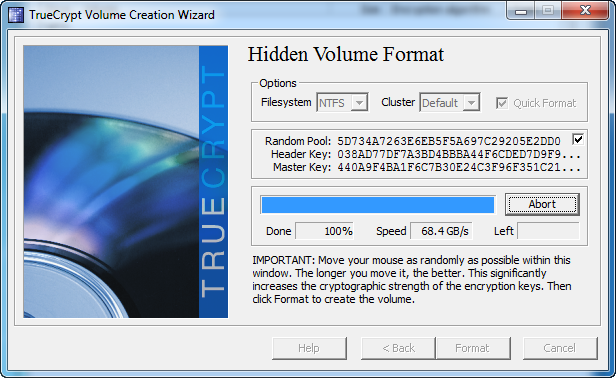 В зависимости от выбранной файловой системы на предыдущем шаге, TrueCrypt автоматически выберет лучшую файловую систему для Вас. Так же, как вы делали это с внешним томом, обязательно наведите курсор мыши на окно, таким образом Вы можете создать по-настоящему случайные числа. Так как весь объем был создан, процесс форматирования будет завершен быстро. После того как вы сделали свой выбор, нажмите кнопку «Формат».