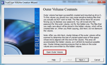 Когда процесс форматирования завершен, TrueCrypt смонтирует внешний том под буквой Z: и прошу вас сохранить некоторые данные на томе. При нажатии на кнопку  «Открыть внешний том»  ,том откроется в проводнике. Как только Вы закончили сохранение некоторых данных в томе, закройте окно Проводника и нажмите кнопку «Далее».