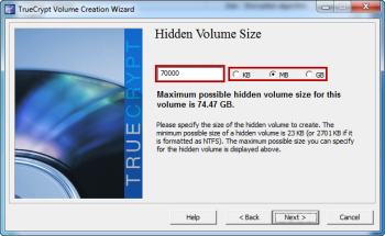 Далее, вам нужно будет устанавить максимальный размер скрытого тома. Так как вы можете не вводить десятичные числа (.) в размере окна, вам может потребоваться настроить вариант  «КБ, МБ, ГБ и»  для удовлетворения ваших потребностей. При выборе размера, введите размер немного меньше, чем максимальный размер. Это позволит расширить внешний том , если вам когда-нибудь понадобится обновить существующие файлы или добавить новые файлы. В зависимости от того, сколько места вы оставили доступным,в TrueCrypt может появиться предупреждающее сообщение информирующее вас об опасности, не оставлять достаточно пространства . После того как вы ввели размер, нажмите кнопку «Далее».
