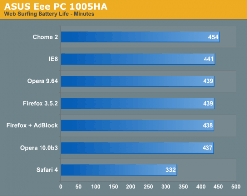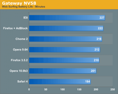 Microsoft`s Internet Explorer 8 является веб-браузером, который меньше всех истощает энергию батарей на двух ноутбуках начального уровня. Большинство других веб-браузеров, за исключением Safari приблизилизь к этому результату, особенно Firefox с Adblock дополнением. Благо Adblock дополнение предполагает, что веб-реклама имеет влияние на использование батареи. Safari 4 оказался худшим в этом тесте веб-браузеров, и выполняет работу хуже всех во свех трёх испытаниях.