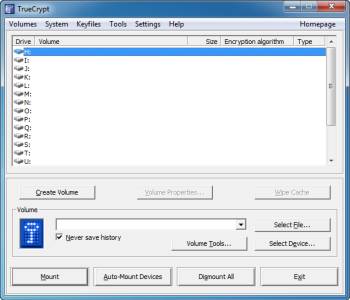 Что я могу сказать о программе TrueCrypt ,программа имеет очень чистый, организованный интерфейс. Большинство функций могут быть доступны только с помощью кнопок в нижней части интерфейса. Список букв диска, в верхней части интерфейса используется для монтажа и демонтажа вашего тома TrueCrypt . По мере необходимости ,я буду рассказывать о некоторых пунктах главного меню.