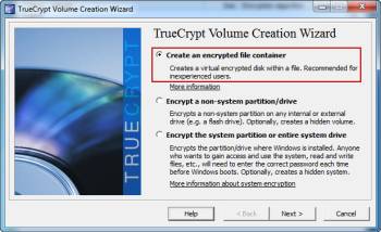 Для ознакомления с TrueCrypt, давайте сделаем основной том,который будет хранить все файлы и папки внутри одного, зашифрованного файла. Хотя это может показаться небезопасно хранить всё в одном файле,внутри видимых файлов, которые можно просто хранить на рабочем столе, но он также служит целью быть портативным, то есть вы можете переместить файл на другой компьютер или другие средства, позволяющие получить доступ к зашифрованным файлам практически из любого места.