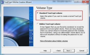 На самом деле, TrueCrypt не знает о существовании скрытого раздела, если вы явно не скажете ему что он существует, об этом, я расскажу позже. Скрытые тома могут быть использованы с автономными томами и даже целыми жёсткими дисками. В этом уроке ,мы будем создавать стандартный том. Нажмите кнопку «Next — Далее», как только вы сделали свой выбор.