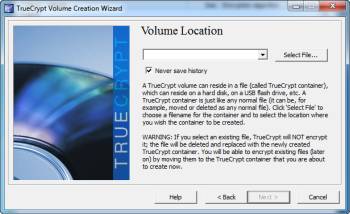 В этом разделе выбираем место для тома. Вы можете сохранить этот том в любом месте вашего компьютера — в корне на диске С:, чтобы похоронить глубоко внутри папки Windows. Убедитесь, что вы включили опцию «Never save history — Никогда не сохранять историю», потому что вы не хотите раскрывать имя и расположение вашего зашифрованного тома. Нажмите кнопку «Select File — Выбрать файл …» , чтобы выбрать место и имя тома.
