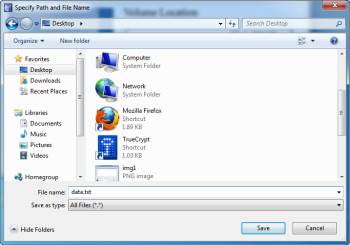 В этом примере я сохранил том на моём рабочем столе. У вас есть возможность предоставить расширение файла, но этого как правило не требуется. Я назвал мой том «data.txt». Теперь, он будет выглядеть как стандартный текстовый документ, если вы сделаете попытку открыть его в блокноте, вы увидите только много случайных символов. Нажмите кнопку «Сохранить» после того как вы назвали ваш том, а затем кнопку «Далее».