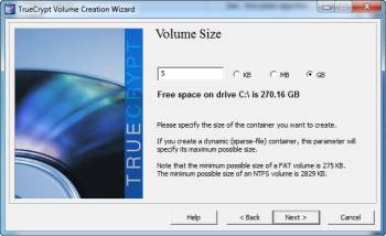 В этом разделе вам нужно установить размер тома. Вы можете сделать большой объем, как вы хотите, пока у вас есть свободное место на жёстком диске. Когда изначально создаётся том, TrueCrypt выделяет все байты в томе и шифрует их, что может занять очень много времени в зависимости от размера вашего тома. TrueCrypt также дает возможность для создания динамических томов, или томов, размер которых увеличивается по мере добавления данных в том, вплоть до достижения максимального размера тома. При создании динамических томов может показаться, что это хорошая идея, я настоятельно рекомендую не использовать их, как это делают разработчики TrueCrypt. Из официальной документации TrueCrypt: ВНИМАНИЕ: выполнение динамических (размещенных разреженных файлов) TrueCrypt тома значительно хуже, чем создание регулярных томов .Динамический (размещённый разреженный файл) TrueCrypt том менее безопасен, потому что можно сказать, какой объем сектора не используется. Кроме того, если данные записываются на динамический том, когда не хватает свободного места в файловой системе хоста, шифрованная файловая система может быть повреждена.