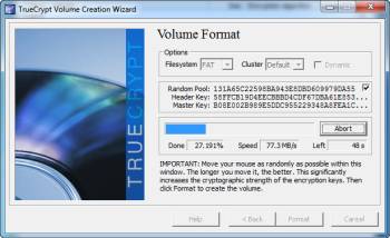 В следующем разделе, вам нужно будет выбрать файловую систему, которую вы хотите использовать. У Вас также есть возможность сделать динамический том — имейте в виду опасность использования динамических томов. Кроме того, если вы помните, в предыдущем разделе мы обсуждали генератор случайных чисел TrueCrypt. Этот шаг создает случайные числа на основе ваших движений мыши по окну. Чем больше вы перемещаете мышь, тем более случайный номер, который будет создан. Кода вы наведите курсор мыши,Вы должны заметить, случайные изменения. После того как вы выбрали, какую файловую систему вы хотите использовать, нажмите кнопку «Формат» для создания и форматирования тома.