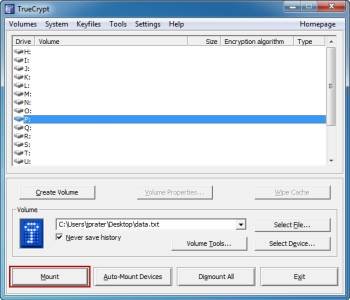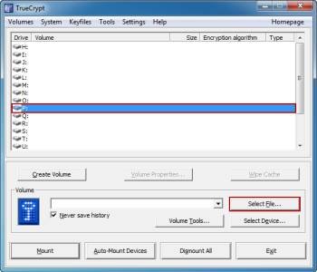 Теперь вы будете монтировать созданный объем, таким образом Вы можете начать хранение в нём данных . Для этого должно быть открыто главное окно TrueCrypt. В открывшемся окне вы увидите список букв дисков. Эти буквы дисков TrueCrypt будет использовать для установки томов в Windows. Выберите букву которую вы хотите связать с томом, а затем нажмите кнопку «Выбрать файл …» , чтобы найти свой файл тома.