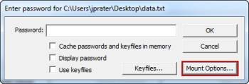Теперь вам нужно ввести пароль для вашего тома. Как вы заметили, у вас есть возможность задать ключевой файл, расширенные функции пароля TrueCrypt обсуждались ранее. Вы должны также заметить еще один вариант: «. Кэш пароли и ключевые файлы в памяти» что делает эта функция – хранит ключевые файлы и пароли в памяти, в течение последних четырех смонтированных томов. Итак, если вы захотите перемонтировать том,вам не придется вводить пароль или переизбирать ваш ключевой файл — просто выберите место тома и том будет установлен автоматически.