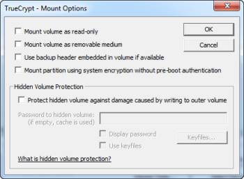 - Защитить скрытый том от повреждений, вызываемых записью на внешний том: Ранее в этой статье я упоминал, TrueCrypt может создать скрытый том внутри автономных разделов тома. При записи на внешний (или не скрытый) том, TrueCrypt не имеет возможности узнать, существует ли скрытый раздел вообще. С этой опцией TrueCrypt практически монтирует тома, так что можно определить физическое местоположение скрытых томов, и, следовательно, защита данных, содержащихся в скрытом томе. Я настоятельно рекомендую вам использовать эту опцию при работе с скрытыми томами.