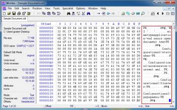 При открытии того же файла в WinHex, схема может показаться немного странной. Вы увидите три колонки информации: одна с надписью «Смещение», другая помечена как шестнадцатеричные цифры 0-F, а столбец данных, которые изложены в красном цвете. Данные колонки говорят вам, какие именно данные присутствуют в физическом файле, независимо от того, является ли файл текстовым документом или аудио файлом. Как вы видите, есть намного больше данных, которые присутствуют в образце документа, чем одно предложение. Это то, что я имею в виду, когда говорю о физическом и логическом содержимом файла.