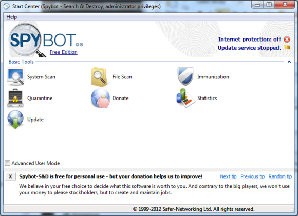 Если ваш компьютер работает медленно,потому что на нём есть malware, Spybot-S&D должны быть первым оружием в вашем арсенале. Это одно из старейших и лучших программных обеспечений для удаления шпионских suites и Вы должны иметь возможность отсеять большинство вредоносных программ, даже на самых медленных машинах.