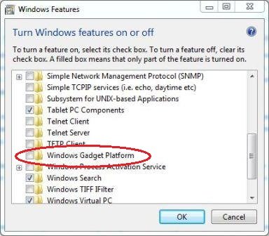 При отключении платформы гаджетов в Windows 7, все подключенные к нему устройства, будут удалены, никакие новые гаджеты не могут быть добавлены, и нет больше меню гаджетов.Для повторной установки и повторного включения платформы гаджеты Windows, просто отметьте галочкой и проверьте вариант «Windows Гаджет платформа».