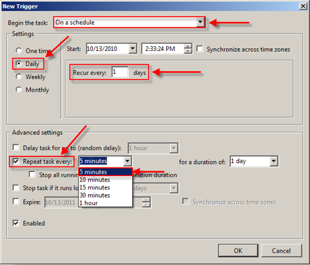 В окне New Trigger ,из раскрывающегося списка выберите По расписанию и выберите переключатель Ежедневно  в разделе настроек и выберите задачу — Повторяются каждый 1 день . Кроме того, установите флажок в Advanced Settings в котором говорится Повторять задачу каждые и из выпадающего списка выберите 5 минут .