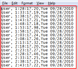 /c echo %username%,%time%,%date% >> UpTime.csv