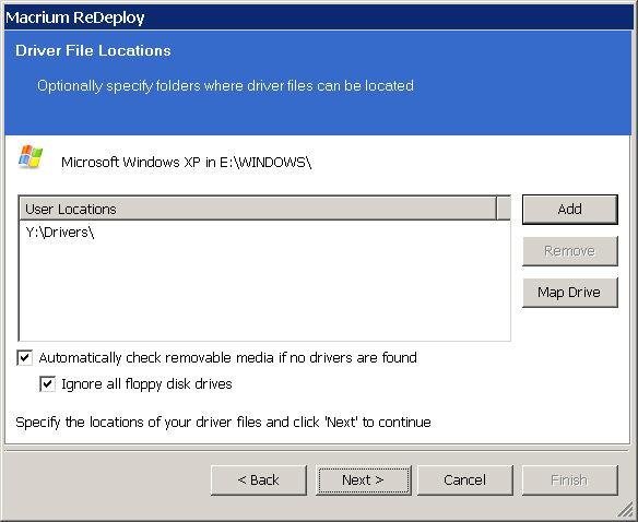 4.Следующее диалоговое окно попросит вас чтобы вы указали драйвера для местоположения запоминающих устройств (такие как RAID-карты). Если вы еще не сделали этого, пожалуйста, вставьте диск драйверов для оборудования,с которого вы собираетесь загрузиться. Это, как правило, должна быть материнская плата или RAID драйвера компакт-диска, щелкните на Добавить чтобы добавить местоположение драйвера. Вы также можете указать дополнительные пути, такие как сетевые папки, нажмите на ссылку «Карта Диска — Map Disc ` чтобы добавить сетевой ресурс. Затем Щелкните на `Next`