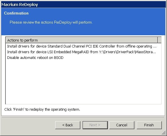 7.Вам будет представлен список действий, которые будут выполнены и нажав кнопку Закончить ,  эти параметры будут применяться для целевой операционной системы. Лог-файл `ReDeploy.log` будет сохранён на диске, содержащий операционную систему .