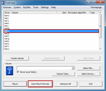 Даже если вы редко монтируете внешний том, но чрезвычайно важно, как установить его правильно. Как вы помните, когда внешний том монтируется, TrueCrypt не имеет возможности узнать, существует скрытый раздел или нет, если вы явно не скажете TrueCrypt ,что он существует. Неправильный монтаж внешнего тома  может привести к необратимому повреждению скрытого раздела без предупреждения со стороны TrueCrypt. Для подключения внешнего тома, откройте TrueCrypt и выберите доступную букву диска, для установки тома. Как только вы выбрали букву, нажмите кнопку «Auto-Mount Devices» .