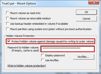 В окне монтирования Опции ,том теперь будет открываться. Здесь вам TrueCrypt расскажет, что существует скрытый раздел на жестком диске. В поле раздела «Скрытый том Защита» , установите флажок «Защитить скрытый том от повреждений, вызываемых записью на внешний том». Теперь вы будете вводить пароль скрытого тома в поле пароля непосредственно под флажком.