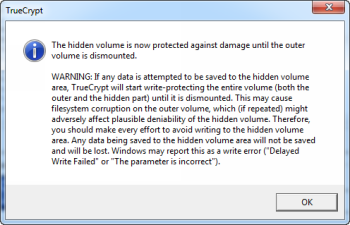 Если внешний том монтируется ,а скрытый раздел не защищен, можно будет хранить достаточно данных, чтобы заполнить жесткий диск, и вы не будете получать предупреждения от TrueCrypt.Вот почему так важна защита скрытого тома , в то время когда монтируется внешний том .