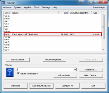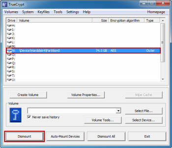 Когда вы закончите работать с внешним томом, отключите его в главном окне TrueCrypt, выбрав смонтированный том из списка, а затем нажмите кнопку «Отключить» . Если у вас установлено несколько томов , вы можете отключить их все сразу, нажав кнопку «Отключить все» . Даже если вы должны были смонтировать внешний том определенным образом, никаких специальных мер, которые необходимы не нужны, чтобы его отключить.