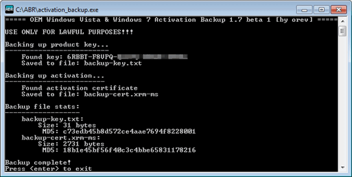 3. Запустите activation_backup.exe из папки ABR ,он создаст два новых файла backup-cert.xrm-ms и backup-key.txt в папке ABR . Нажмите Enter, чтобы закрыть ABR. Резервный ключ продукта не является таким же, как ключ для Windows и является OEM-ключом.