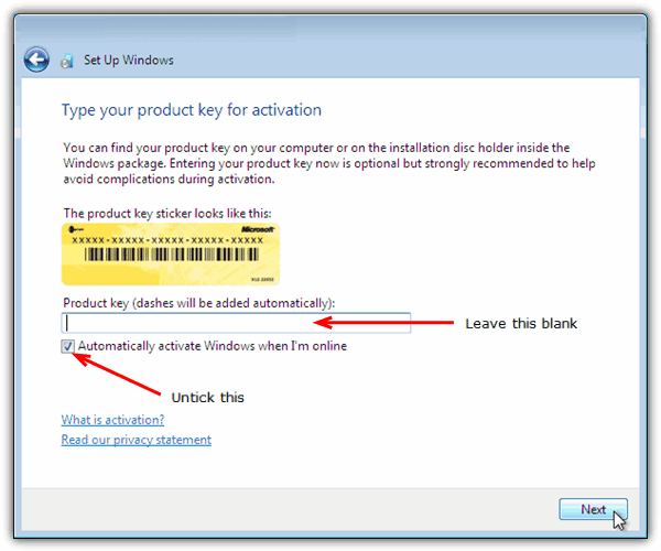 5.Установите чистую версию Windows 7.Во время установки,если будет запрос на ввод ключа продукта,оставьте ключ продукта пустыми,и снимите флажок где он должен активироваться автоматически,когда ваш компьютер находится в режиме онлайн.