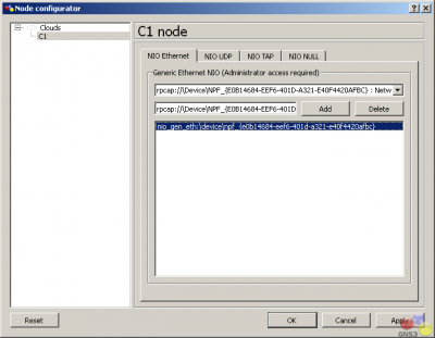 Перетащите Облако — Cloud в вашу рабочую область. Щелкните правой кнопкой мыши на Cloud и выберите Настройка . Нажмите на C1 подоблака — under Clouds,выберите вкладку NIO Ethernet . Для этого необходимы права администратора (суперпользователя под Linux).