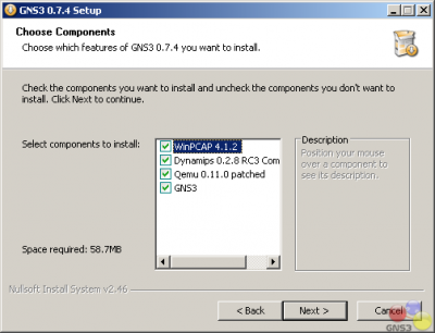 Начнёт работать Мастер GNS3 установки . Все что вам остаётся сделать , это нажимать на следующую кнопку и соглашаться. Работа с GNS3 зависит от ряда других программ . Эти зависимости включают WinPCap, Dynamips и Qemu и эти компоненты вместе с GNS3 все выбраны по умолчанию для установки. По умолчанию мастер установки GNS3 . выбрал всё за вас.