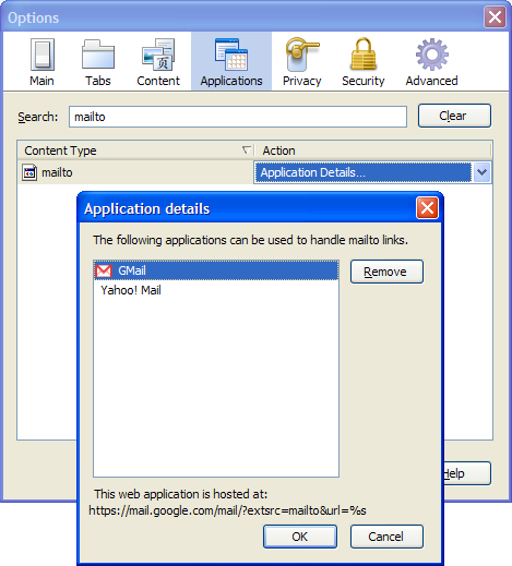 Чтобы удалить обработчик Gmail,зайдите в меню Инструменты Firefox, выберите «Параметры». (Mac пользователям, перейдите в диалоге настроек.) В закладке Приложения, поиск Mailto. Из выпадающего меню в Mailto обработчика, выберите Приложения Подробная информация, как показано на рисунке. Здесь вы можете выбрать веб-приложение обработчика и удалить его с помощью кнопки.