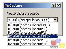 Стрелка вниз позволит вам выбрать, какой выбрать интерфейс для мониторинга (R1 s0/0 или R2 s0/0). WireShark начнет работать автоматически, если он был настроен в окне настроек. Обратите внимание, что мы можем выбрать тип инкапсуляции для последовательных интерфейсов. Вариантами являются: HDLC, PPP и Frame-Relay (FR). По умолчанию для инкапсуляции выбран серийный интерфейс Cisco HDLC.