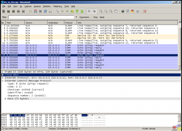 Теперь давайте сгенерируем трафик для тестирования наших захваченных пакетов. Ping R2 от R1. Обновите окно WireShark, нажав Ctrl + R . Прокрутите вниз, чтобы увидеть ICMP запрос и ответ пакетов в результате пинга. Что бы увидеть захватили ли мы пакеты ,обновите окно .