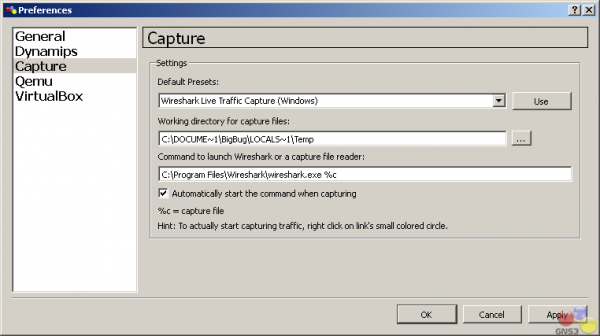 Сделайте резервное копирование и укажите предпочтения для захвата пакетов. Выберите Предпочтения в меню Редактирования GNS3. Затем в левой панели нажмите на кнопку Захват . Теперь вы можете указать рабочую папку для захвата файлов, используйте команду для запуска WireShark, установите следует ли автоматически запускать WireShark, когда Вы хотите захватить пакеты.