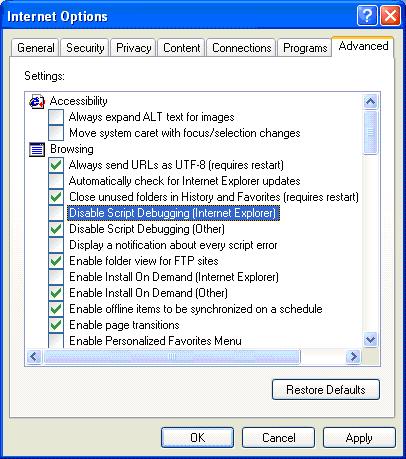 Microsoft Script Editor (MSE) является мощным инструментом, который предназначен для отладки Java-скриптов, используя Internet Explorer в качестве сервера сценариев. Он поставляется как бесплатный компонент Office XP и Office 2003. Это привлекательный вариант, когда всё, что вам нужно, для отладки Java-скриптов для IE и у вас нет Visual Studio. NET установленного на вашей машине.Это Вы можете проверить на МФБ на вашей машине, нажав кнопку Просмотр опции IE и посмотреть, можете ли Вы найти вариант отладчика сценария.