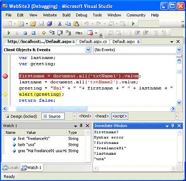 Листинг функции JavaScript показывает, включенные в образец страницы ASP.NET. Вы всегда должны включать ключевое слово «Debugger » в качестве первой строки кода сценария Java 5если вы хотите использовать для отладки Visual Studio 2005. Это ключевое слово автоматически вызывает отладчик Visual Studio на стороне клиента.Как только мы запускаем указанный код выше, мы получаем выход смотрите на скриншоте ниже.