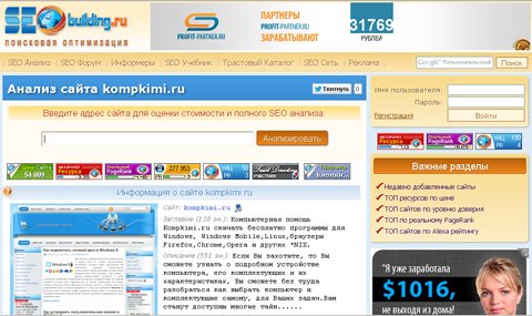 Более подробную информацию и презентацию сервиса комплексного SEO анализа от SEObuilding.RU,вы можете найти на форуме по следующей ссылке Сервис комплексного SEO анализа.