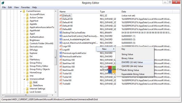HKEY_CURRENT_USER \ Software \ Microsoft \ Windows \ CurrentVersion \ ImmersiveShell \ grid