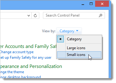 Если окно Панель Управления отображается в режиме Категории, выберите в раскрывающемся списке рядом с Просмотр в верхнем правом углу. Выберите либо Крупные значки или Маленькие иконки.