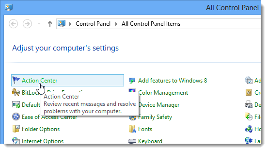 Закройте Action Center в окне Панель Управления, нажав кнопку X в верхнем, правом углу окна.