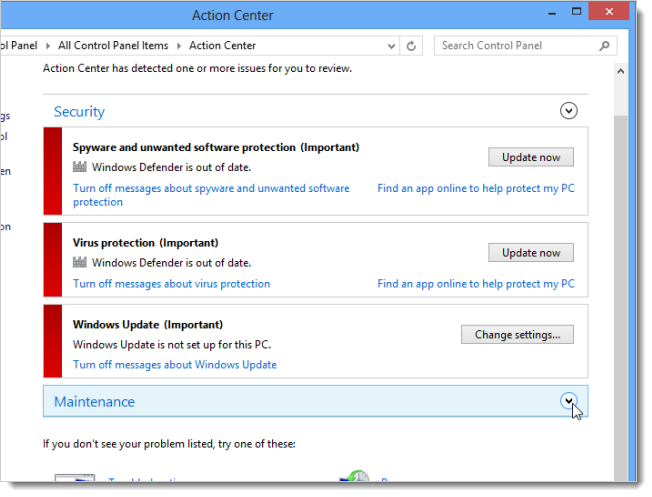 В окне Action Center, нажмите кнопку со стрелкой вниз на заголовке Обслуживание , чтобы открыть этот раздел.