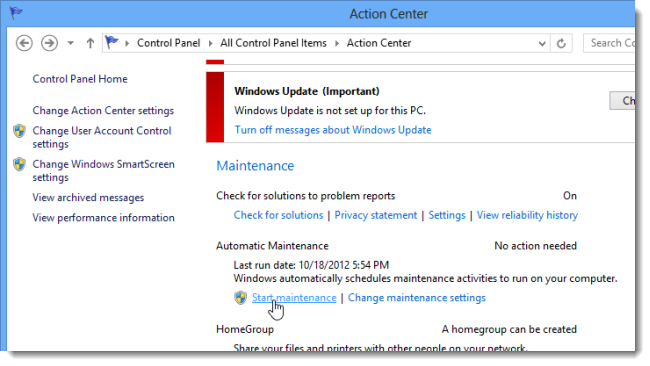 Далее я покажу вам,как вы можете изменить режим автоматического поддержания параметров в Windows 8 и как вы можете начать и остановить обслуживание вручную.