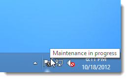 В то время как обслуживание выполняется в фоновом режиме, значок часов показывает на флаг Action Center, значок в области уведомлений, показывающий сообщение “техническое обслуживание в процессе” , когда вы перемещаете курсор мыши на значок.