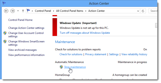 В то время как техническое обслуживание в процессе работы, ссылка Прекратить обслуживание доступна под Автоматическое обслуживание. Нажмите на ссылку, чтобы остановить обслуживание.